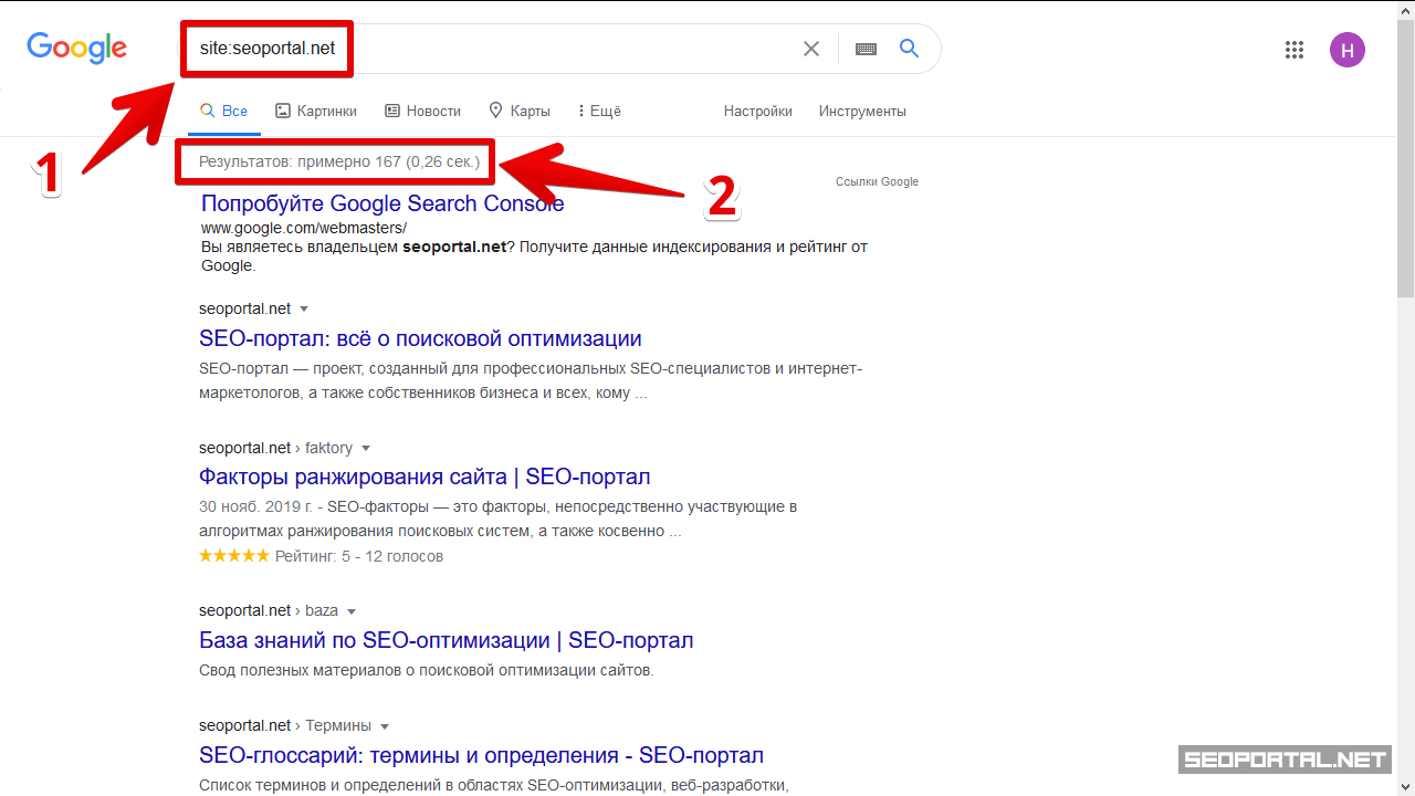 site:[доменное имя сайта], в результатах поиска будут присутствовать только страницы указанного сайта. Обратите внимание на общее число результатов — это и есть количество проиндексированных страниц. - Специальные плагины для браузера