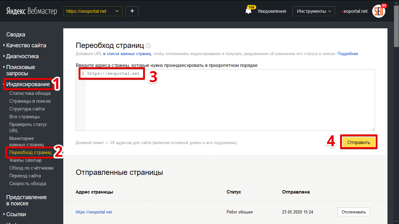 Кроме этого ускорить индексирование новых или обновлённых страниц сайта можно с помощью соответствующих возможностей в сервисах поисковых систем: