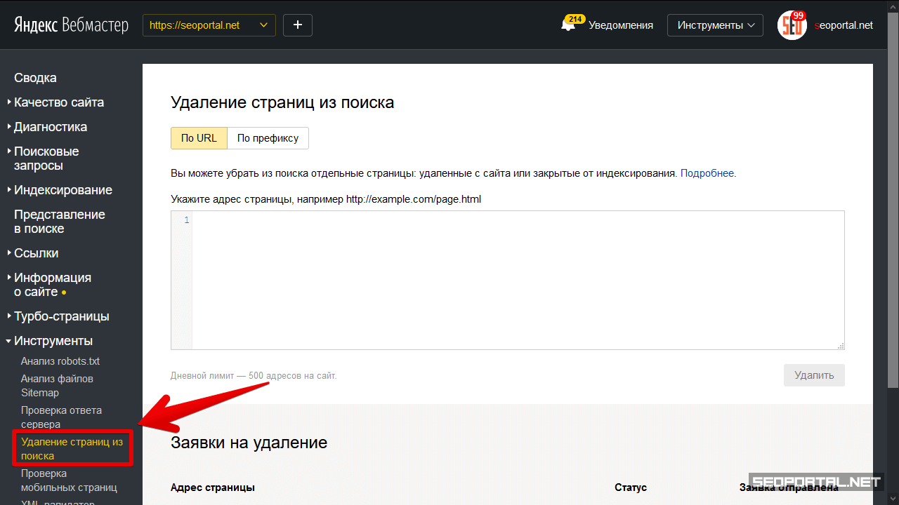 Ускорить удаление страницы из индекса можно в сервисах поисковых систем: