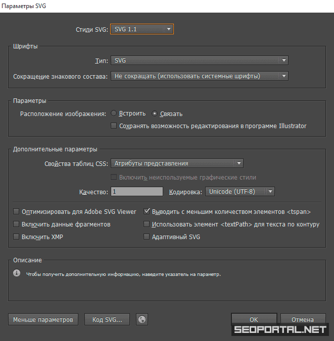 4. откроется модальное окно программы Illustrator с параметрами сохранения файла в формате SVG: