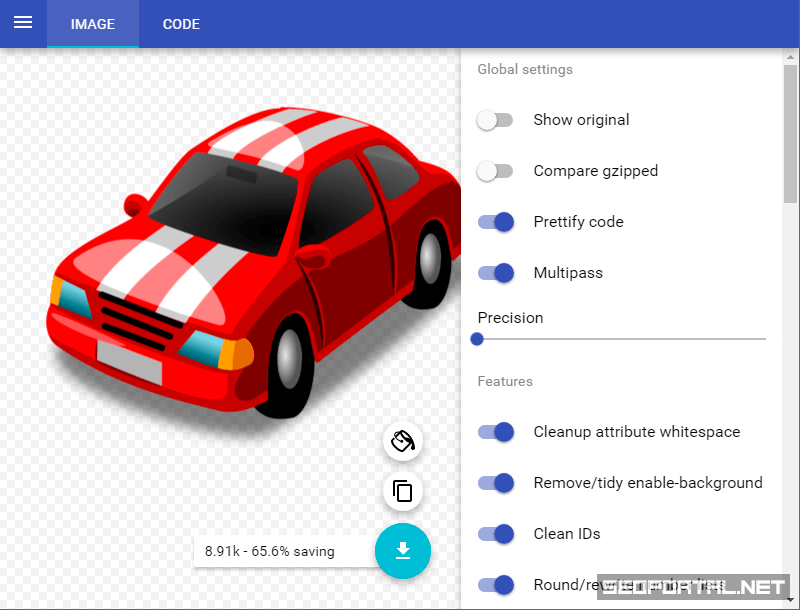 Веб-приложение SVGOMG позволяет оптимизировать SVG-картинки онлайн, при этом предоставляя всю необходимую информацию в своём интерфейсе: можно контролировать изменение веса файла в процентном соотношении, изменяя те или иные опции, а также видеть, отражается ли применение настроек на самом изображении: