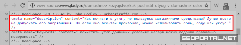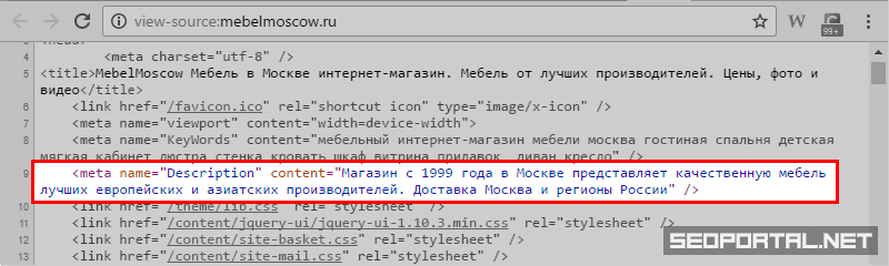 В данном примере неестественность словосочетаний просто «бросается в глаза»: оптимизатор сайта явно не испытывает опасений относительно восприятия такого рода сниппета ни поисковиками, ни пользователями. Код мета-тега выглядит следующим образом: