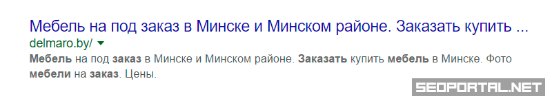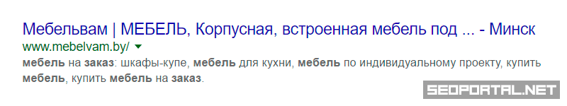 В неестественности словосочетаний «Мебель на под заказ», «Заказать купить мебель» сомневаться не приходится. Это может означать лишь то, что Google даёт веб-мастерам возможность самим влиять на представление сниппетов: мол, наши алгоритмы ранжируют страницы, а как им выглядеть в поиске – зависит только от вас.