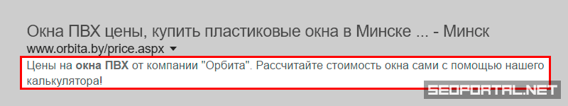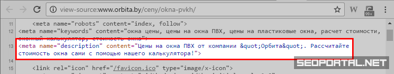 <!-- пример мета-описания с конкретным кратким описанием: --> <meta name="description" content="Цены на окна ПВХ от компании «Орбита». Рассчитайте стоимость окна сами с помощью нашего калькулятора!" />
