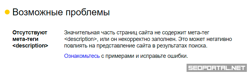 Сервис Яндекс.Вебмастер прямым текстом («Отсутствуют мета-теги <description>») указывает на проблемы с мета-описанием на сайте в разделе «Диагностика сайта» при наличии таковых: