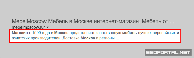 Google куда более лояльно относится к использованию содержимого мета-описаний в сниппетах, предоставляя веб-мастерам и SEO-оптимизаторам возможность максимально влиять на сниппеты поисковой выдачи (это касатся не только аннотаций). Например, проанализировав выдачу Google по запросу «мебель в москве», на момент проверки оказалось, что 9 из 10 аннотаций в сниппетах включали содержимое мета-тега Description соответствующих страниц.