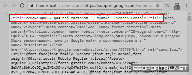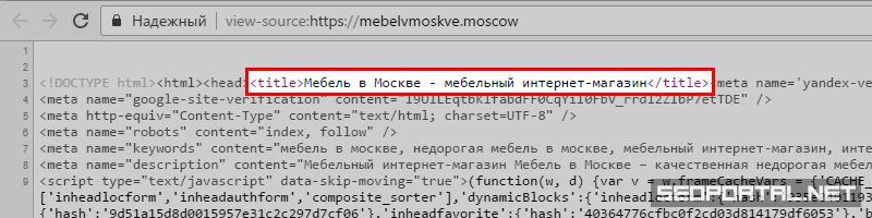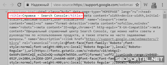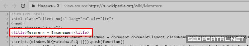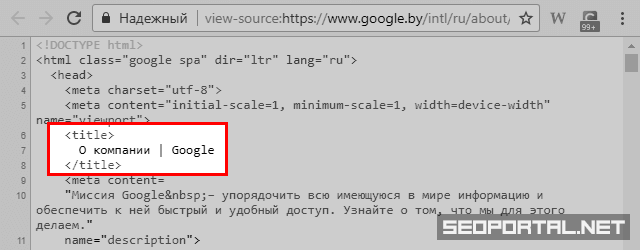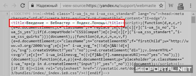 Как отмечалось ранее, название страницы находится в HTML-блоке head. В отличие от мета-тегов, «тайтл» является обычным парным HTML-тегом, содержание которого заполняется между открывающим и закрывающим тегами: