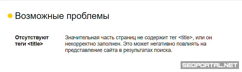 Яндекс акцентирует внимание веб-мастеров на проблемы с тегом title на страницах сайта в разделе «Диагностика сайта» сервиса Яндекс.Вебмастер: