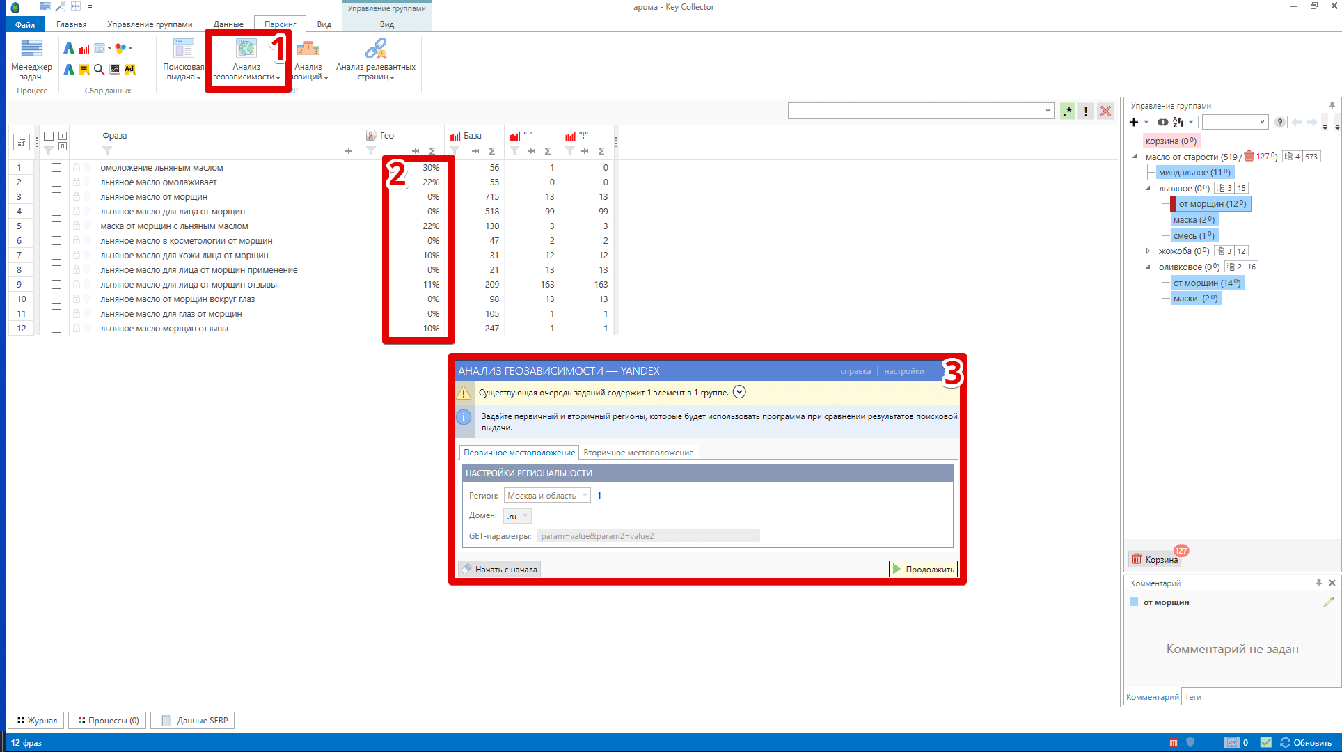 Разумеется, процесс проверки можно автоматизировать. Отличным решением для этого является программа Key Collector версии 4, которая определяет геозависимость поисковых фраз в процентном соотношении: например, если по результатам проверки в разных регионах в выдаче по запросу будут отличаться 2 результата из 10, то программа присвоит этому запросу 20% геозависимости. В Key Collector версии 4 можно вручную выбирать регионы для проверки как в Яндекс, так и в Google.