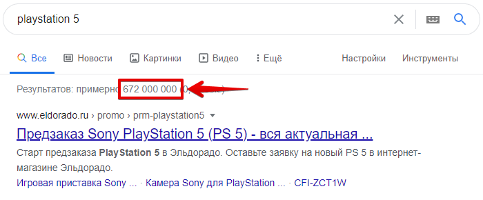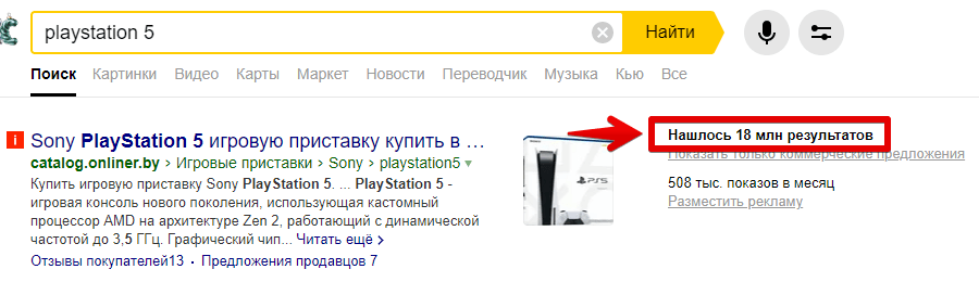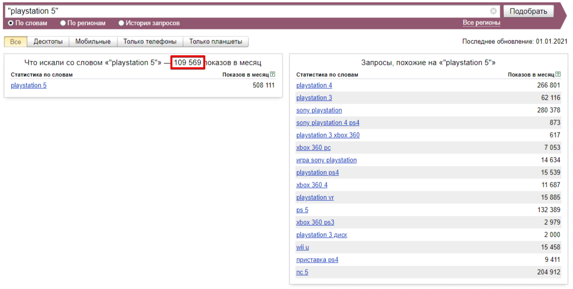 Например, с фразой «playstation 5» к Яндексу в течение месяца обращались 109 569 раз, т. е. её частотность равна 109 569.