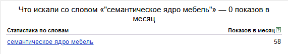 Бывает, что базовая частота фразы имеет очень высокое значение, в то время как фразовая и, как следствие, точная частоты равны нулю. Например, запрос «семантическое ядро мебель» имеет базовую частоту 58 и фразовую частоту 0. Это значит, что такой запрос имеет расширенные версии с дополнительными словами (например «семантическое ядро магазина мебели»), суммарная частотность которых равна 58.