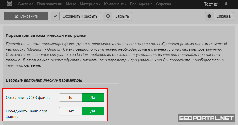 Отобразится список параметров автоматической настройки. - Активируйте параметры «Объединить CSS файлы» и «Объединить JavaScript файлы».