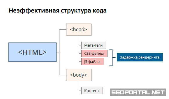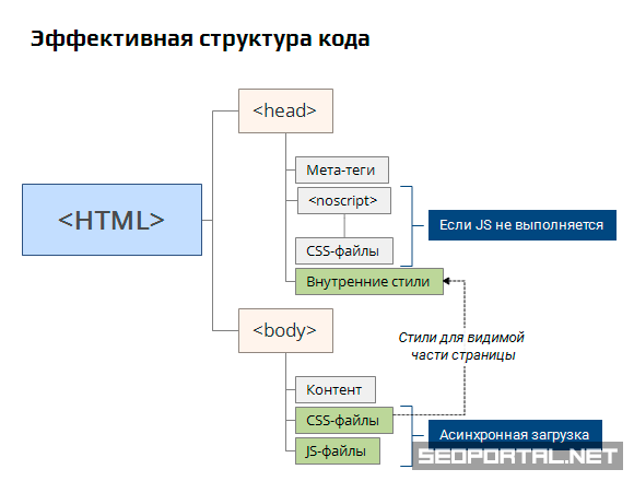 Структура кода страницы сайта определяет порядок загрузки внешних CSS- и JS-ресурсов, а также внутренних HTML-данных, тем самым влияя на время отображения страницы в браузере и скорость загрузки сайта в целом.