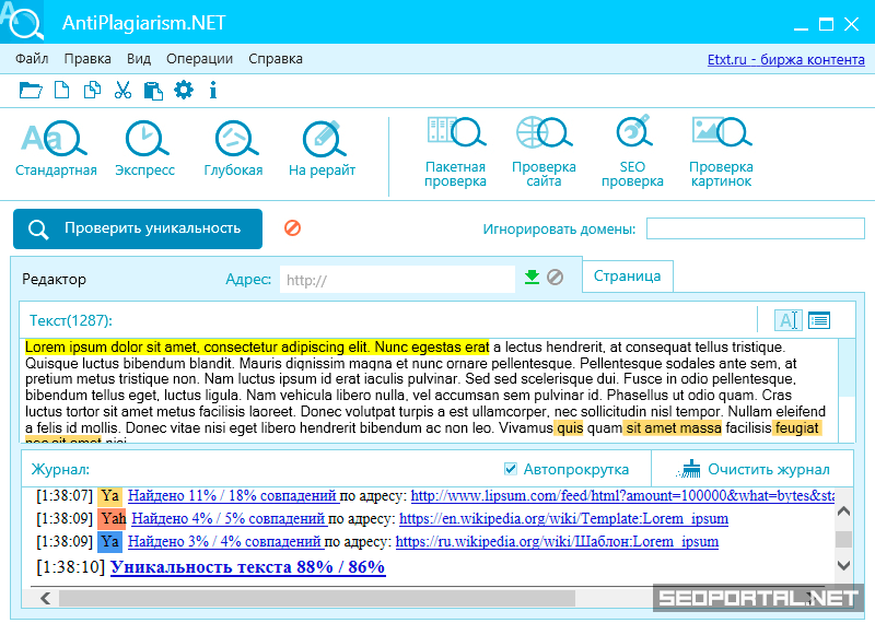 TEXT.RU сайт для проверки уникальности текста со множеством дополнительных возможностей, среди которых проверка орфографии, SEO-анализ текста, а также биржа контента.