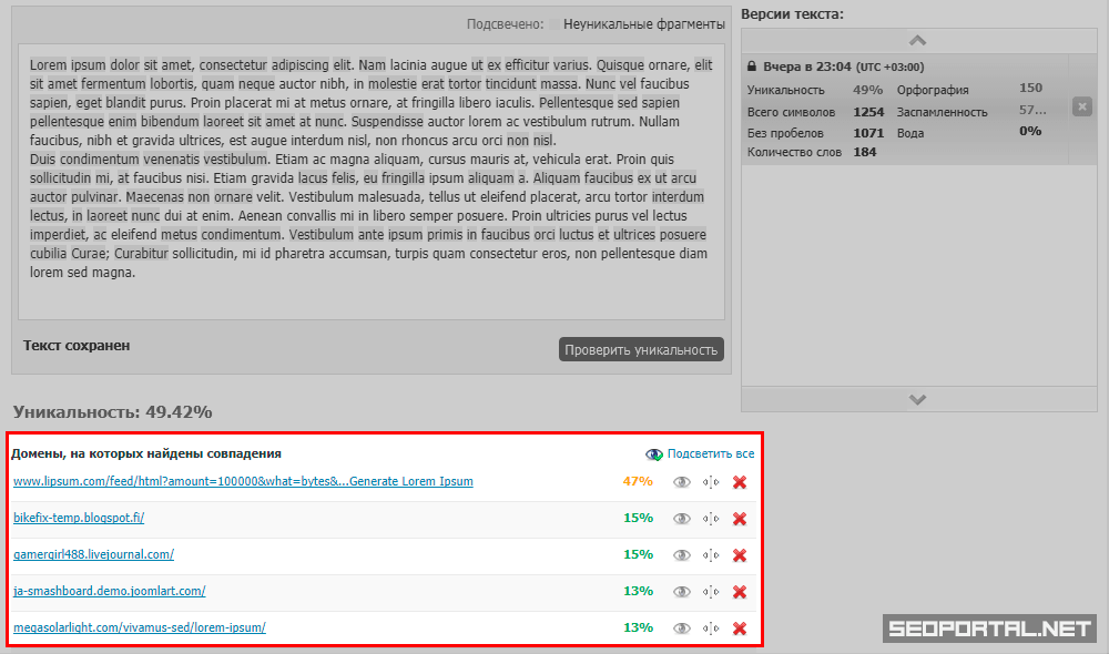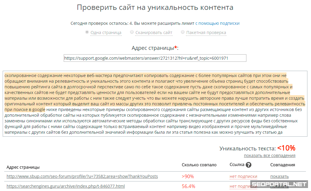- будет определён процент уникальности для указанного текста и процент совпадений в контенте найденных страниц.