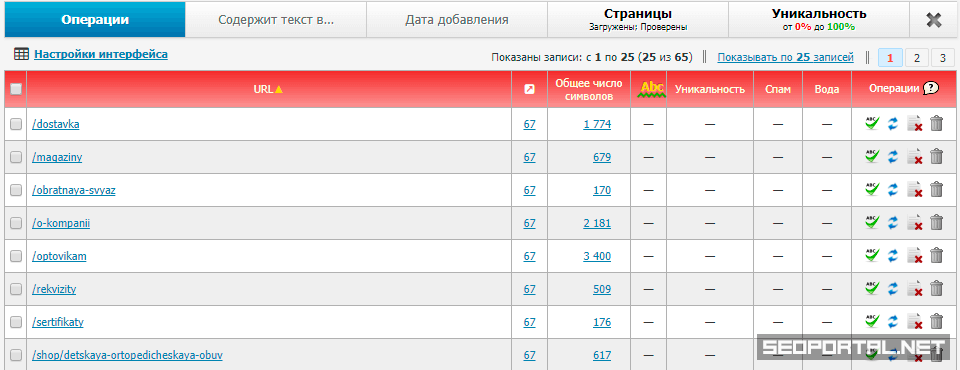 - После указания URL-адреса сайта сервис загрузит тексты со всех доступных страниц. Они будут отображаться в виде таблицы.