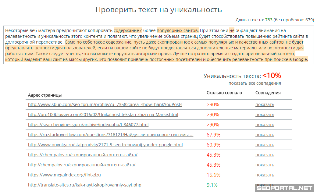 В качестве результата анализа онлайн-сервис отобразит список найденных веб-страниц с совпадениями. При клике по ссылке «Показать» в колонке «Совпадения» в области с текстом будут подсвечены найденные совпадения.