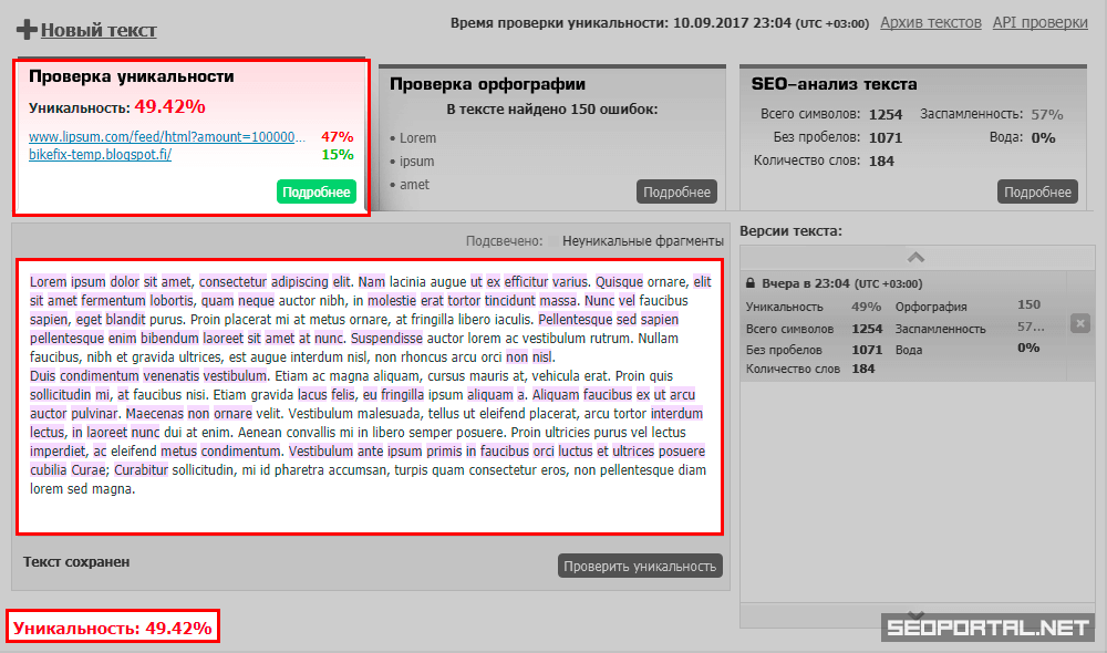 - процентное значение уникальности SEO-текста,