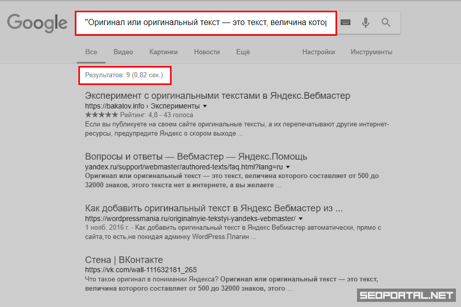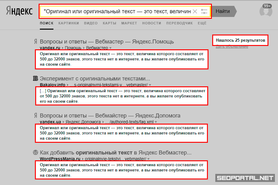 Проверить текст на уникальность можно отправив в Яндекс запрос, содержащий часть данного SEO-текста в кавычках. SERP Яндекса будет содержать страницы, полностью соответствующие введённому запросу (текст из запроса будет отображен и подсвечен в сниппетах), также можно обратить внимание на количество результатов поиска.