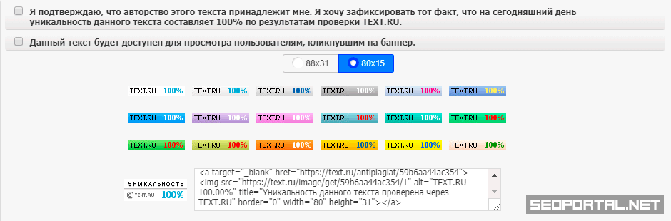 - Позволяет зафиксировать текст с уникальностью в 100% с предоставлением баннера для размещения на веб-странице. Это способствует снижению воровства контента, т. к. сервис сможет подтвердить первоисточник в нужный момент.